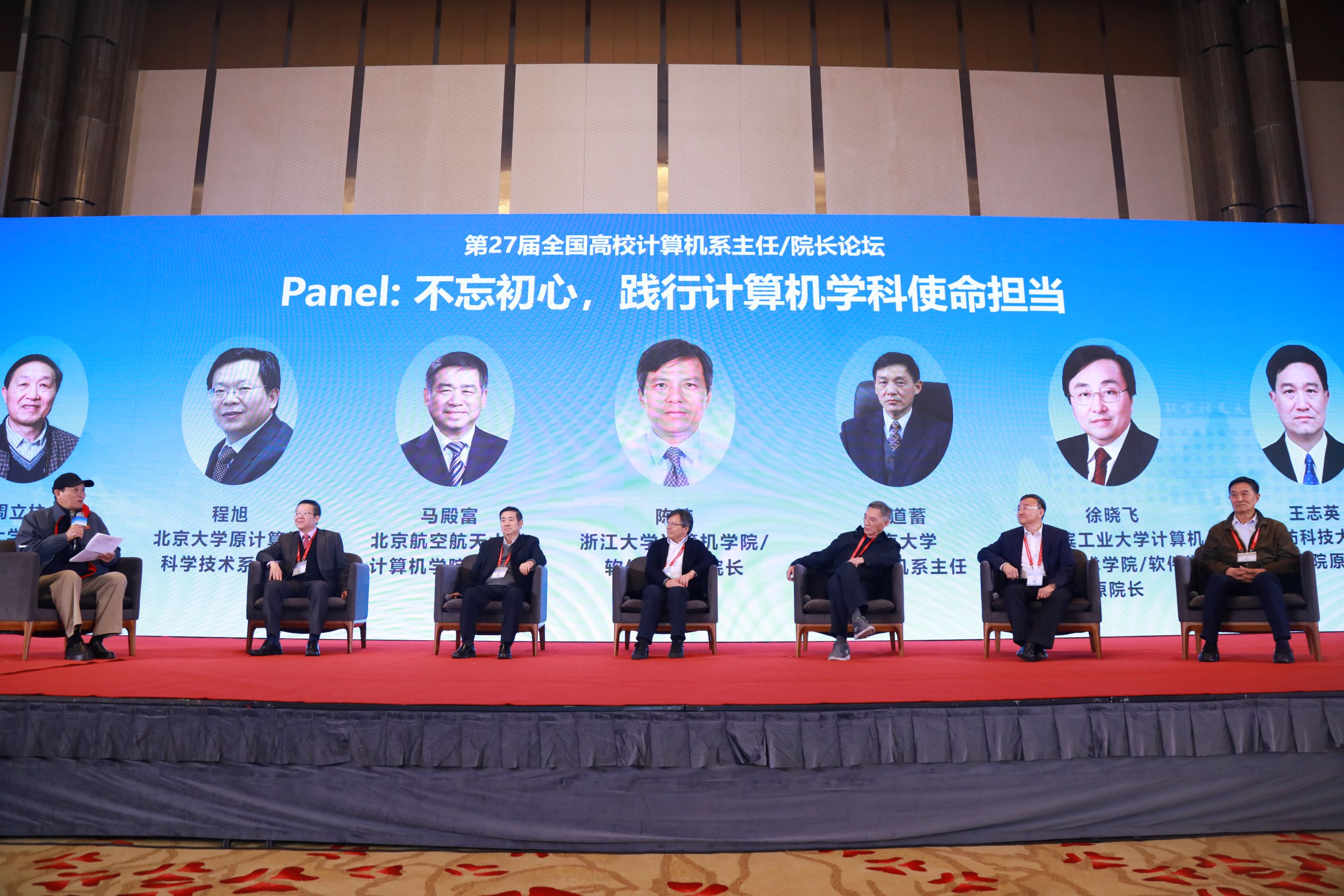 全国高校计算机系主任/院长论坛是由北京大学、best365手机版官方网站、国防科技大学、哈尔滨工业大学、南京大学、清华大学、浙江大学(按照学校名称拼音首字母排序)于1998年联合发起成立,首届论坛由best365手机版官方网站承办。本次论坛特别设置了主题为“不忘初心,践行计算机学科使命担当”的panel环节,邀请清华大学计算机科学与技术系原系主任周立柱教授、北京大学原计算机科学技术系主任程旭教授、best365手机版官方网站best365手机版官方网站原院长马殿富教授、南京大学原计算机系主任陈道蓄教授、浙江大学best365手机版官方网站/软件学院原院长陈纯院士、哈尔滨工业大学计算机科学与技术学院/软件学院原院长徐晓飞教授、国防科技大学best365手机版官方网站原副院长王志英教授等发起论坛的七所院校代表在论坛首办地北京再次相聚,共议初心,共话未来。