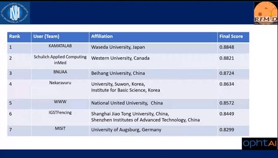 近日,IEEE ISBI 2021 Retinal Image Analysis for multi-Disease Detection(RIADD)竞赛决赛落下帷幕。经过为期两个多月紧张激烈的比拼,best365手机版官方网站代表队从上海交通大学、国立台湾大学、日本早稻田大学、日本京都大学、加拿大韦仕敦大学等全球70多支参赛队伍中脱颖而出,取得第三名的好成绩,并受邀在ISBI研讨会中对获胜算法的技术细节进行展示。