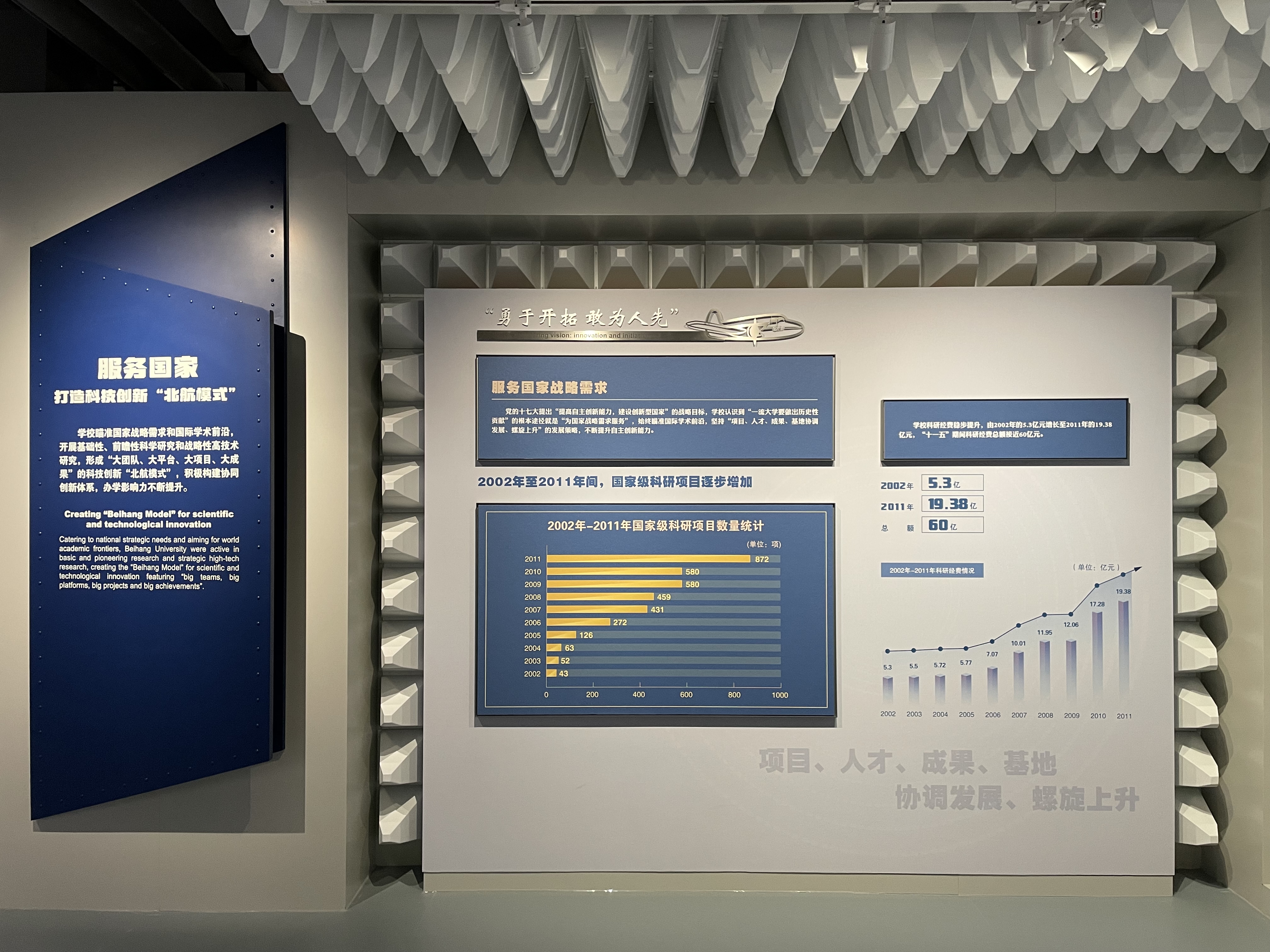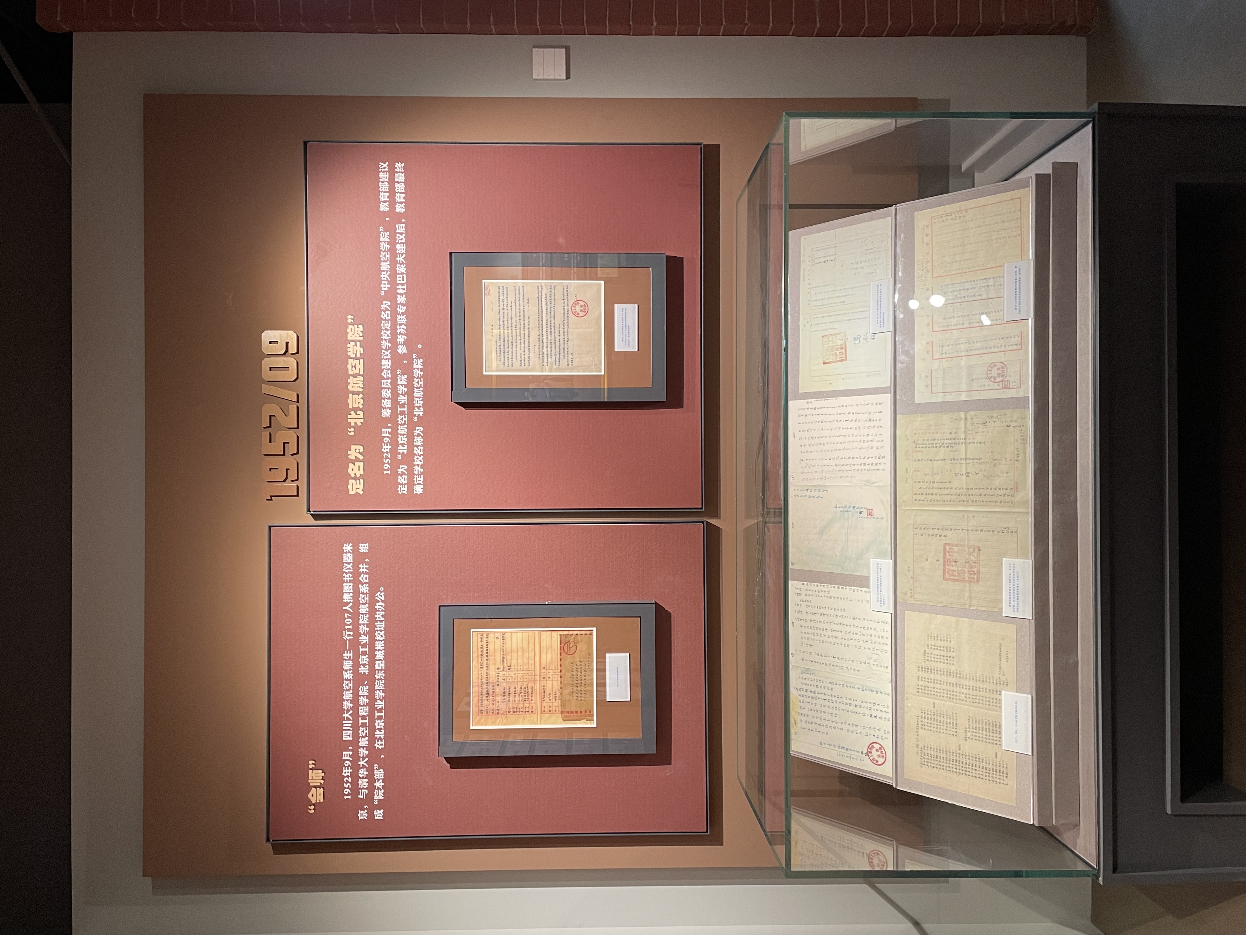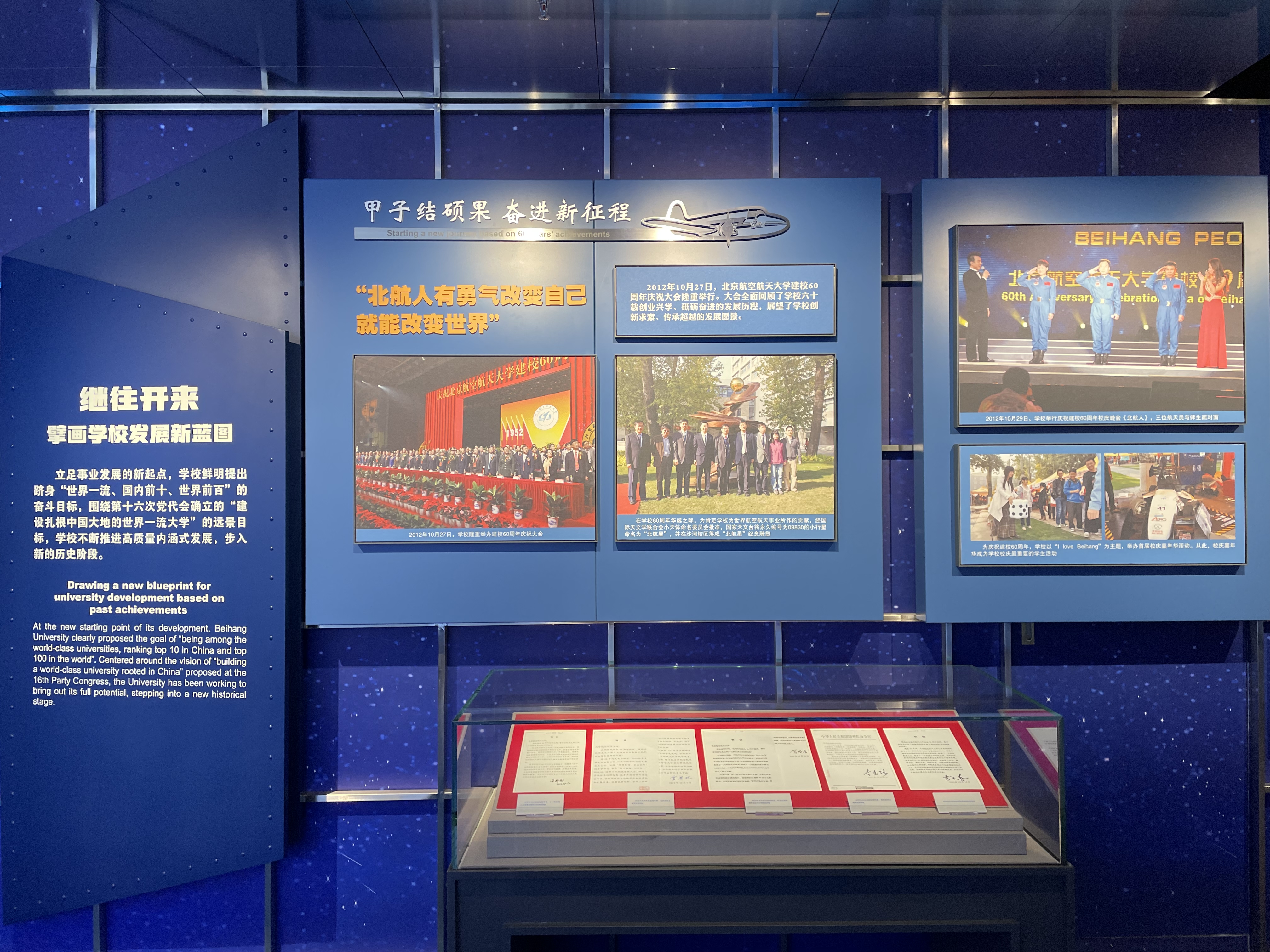 展览共分为四个部分:“创业兴学、与国同行”,回顾了从建校到1977年的历史;“抢抓机遇、改革奋进”回溯了1978-2001年的学校发展;“好中快进,科学发展”总结了2002-2011年学校事业的发展;“立德树人,逐梦一流”展现了“空天报国”精神在新时代传承弘扬。